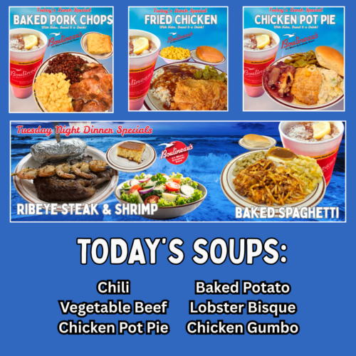 Enjoy home cooked meals daily and Boulineau's FAMOUS fried chicken